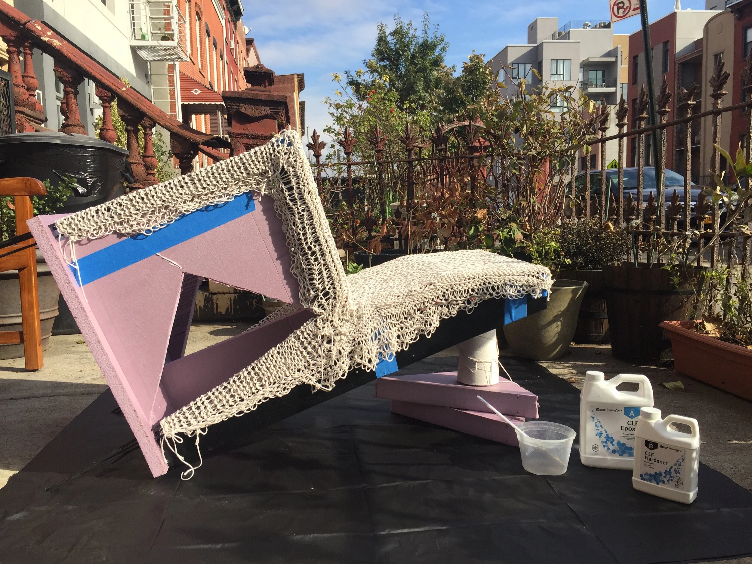 Our new casting method was to erect the dry crochet on the molding rods and apply the resin with rollers, which was successful as a procedure, but not as a final process. Unfortunately rolling on the resin created really uneven results: some areas were over saturated and became plastic-y. Other areas were accidentally skipped altogether. The bare patches of the crochet really depreciated the strength we had previously achieved. However, this method led us to believe that in an industrial process the entire chair could potentially be dipped in resin in order to fully saturate the interior of the voids and the center of the joints.