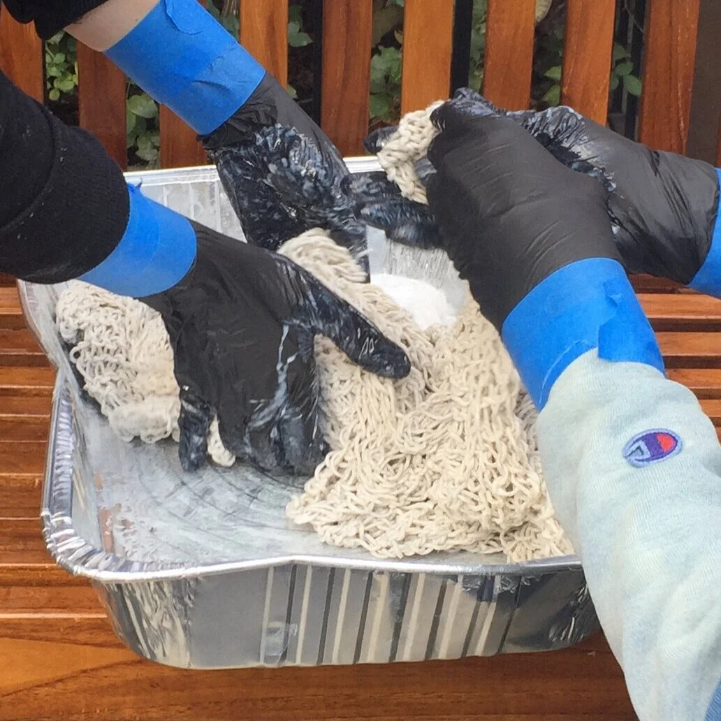 Painting, rolling and scrunching or kneading the epoxy onto the material each yielded varying results depending on the material. Cotton created the strongest composite with a kneading method, which allowed the fibers to become more fully impregnated, but that also loosened some fibers, creating sharp spurs once the resin cured.