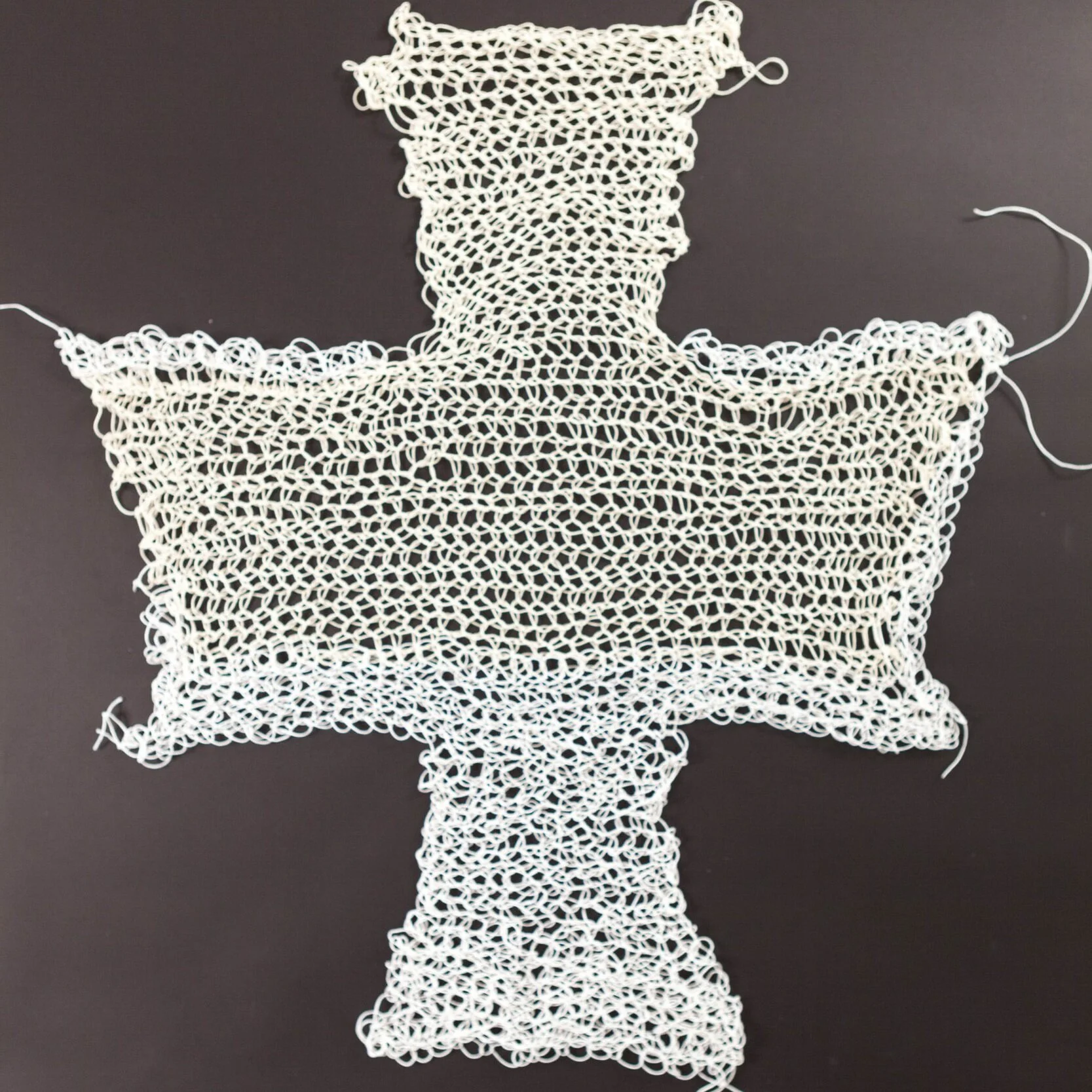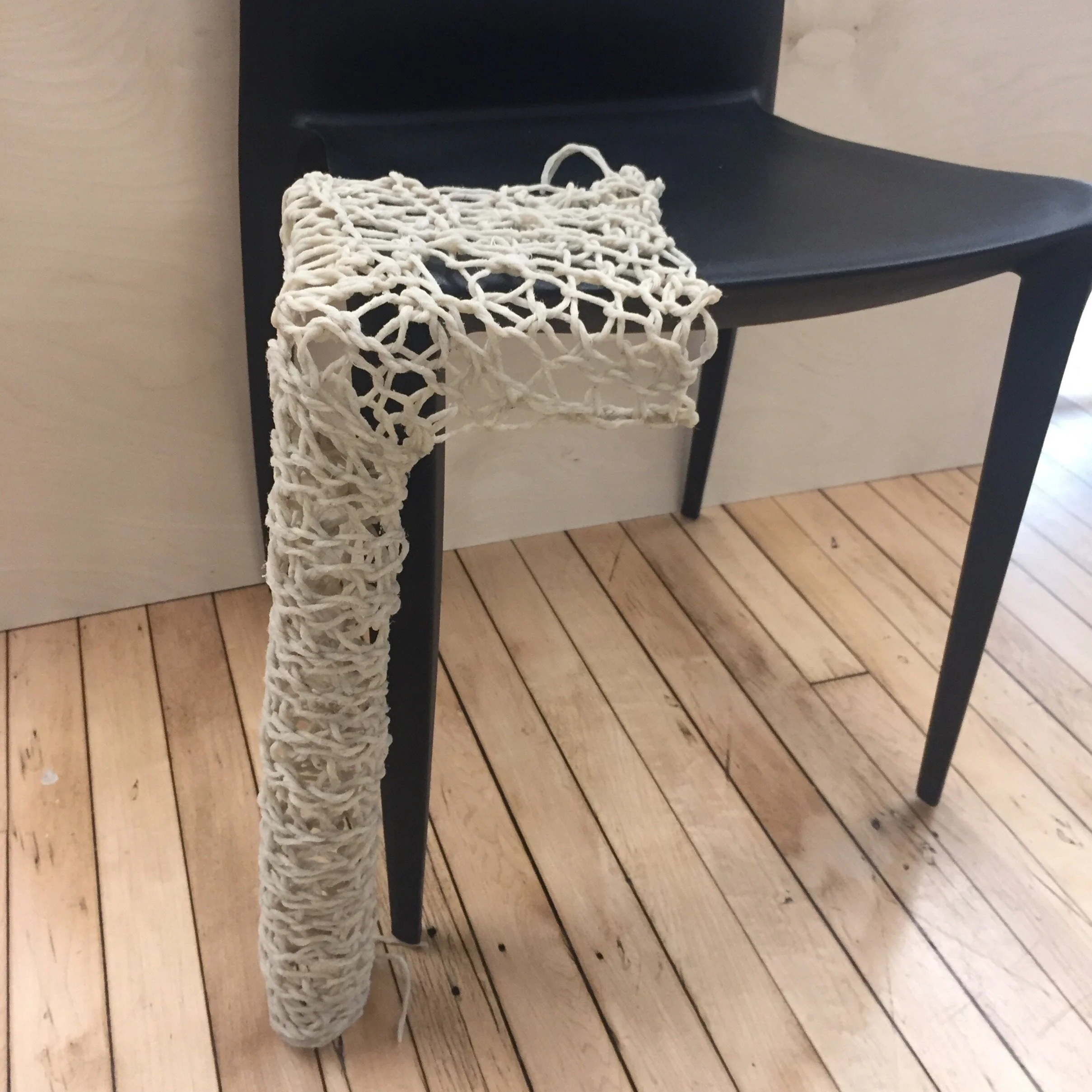 Hand crocheted 24-ply cotton string makes extra chunky, extra strong material. A hollow column constructed in a circular knitting style gave way to a corner to create our strongest geometry yet. It was particularly impressive in compression. One key insight of our vast material experiments was that circular knit patterns coupled with cylindrical geometry yielded extremely robust properties. This became a basis of all our future models